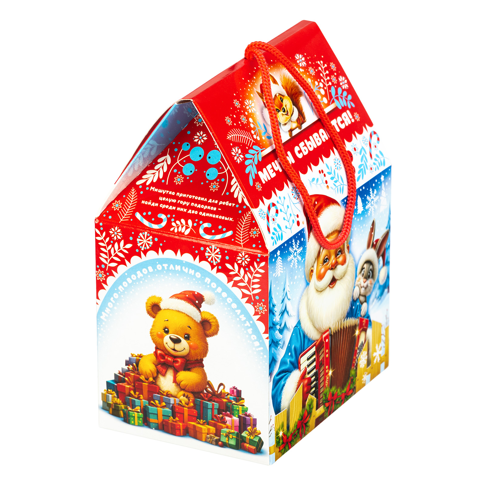 Этот компактный подарочный набор с удобной ручкой-шнурком идеально подходит для праздника в детском учреждении. Упаковка выполнена в сочетании ярко-красного цвета с различными холодными тонами, что придает ей привлекательности. На передной части мы видим забавную иллюстрацию с главным героем - веселым рыжим жеребцом Кешей, который держит в руках небольшую голубую гитару и, видимо, репетирует песню для новогоднего праздника. Внутри подарок также прекрасен: в его состав входит 600 грамм разнообразных лакомств и небольшой памятный сувенир, который еще долго будет напоминать всей вашей семье об этих замечательных праздниках.